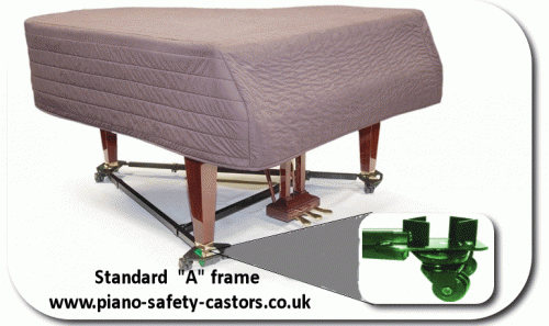 Grand piano's should have an "A" frame fitted. Also, if the grand is on a stage or platform, locking wheels should also be fitted. Moving a grand piano can be dangerous, particularly if the floor surface is uneven. i.e. over floorboards or concrete. If the leading leg should snag, the momentum of the instrument could cause the leg to buckle under the instrument with potentially serious consequences. By fitting a trolley frame, this risk can be removed